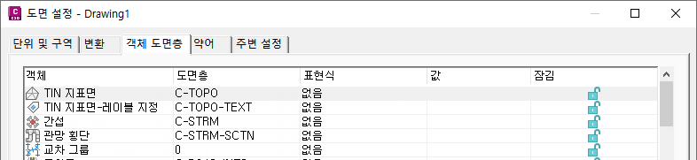 도면 설정 대화상자의 객체 도면층 탭에서 객체의 기본 기층을 지정합니다.