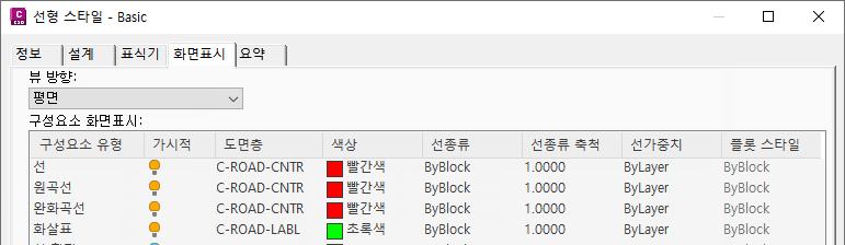 주: Layer 0에는 구성요소 화면표시 설정에서 특별한 의미가 있습니다. 도면층을 0으로 설정할 경우 해당 구성 요소에 객체 기층이 사용됩니다. 예를 들어, 선형 기층이 C-ROAD이고 선 구성요소 도면층이 0으로 설정된 경우 선형 선은 도면층 0이 아닌 도면층 C-ROAD에 위치한 것처럼 동작합니다.
