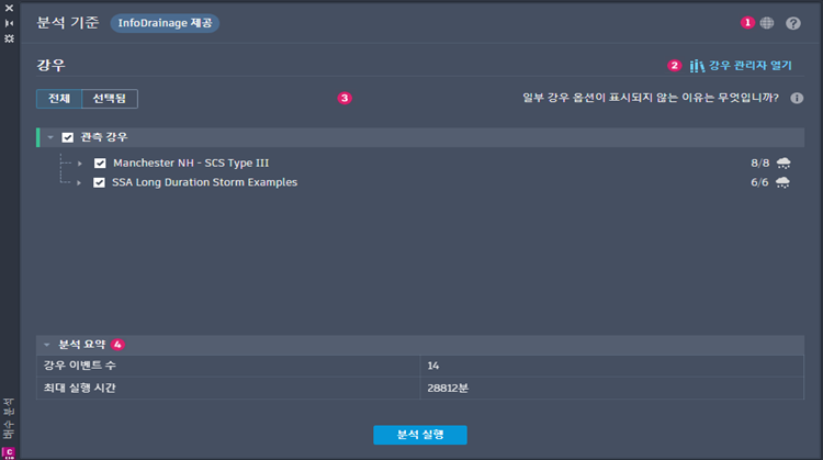 분석을 시작할 때 사용하는 분석 기준 사용자 인터페이스를 통해 현재 배수 시스템을 테스트하기 위한 강우 데이터를 지정할 수 있습니다. 프로젝트에 대해 강우 세트가 구성되지 않은 경우 인터페이스에서 강우 관리자만 열 수 있습니다. 분석 프로세스를 시작하려면 강우 데이터가 필요합니다.