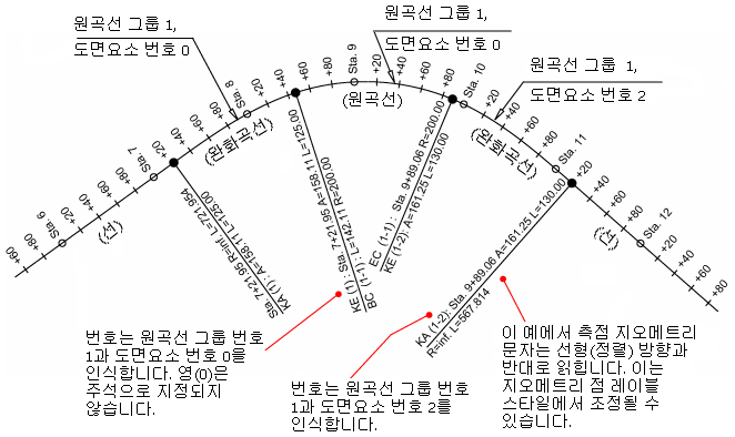 선형을 작성할 때에는 선형 레이블 대화상자에서 지정한 레이블이 자동으로 지정됩니다. 레이블은 주 측점 및 보조 측점과 같은 특정 점에서 선형을 따라 적용됩니다.