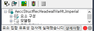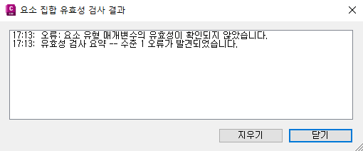 모형에서 오류가 발생하면 상태 막대 메시지에 요소 유효성 검사가 실패했다는 내용이 나타나고 대화상자가 표시되어 오류를 나열합니다. 오류를 검토하고 필요한 수정을 한 다음 유효성 검사가 성공할 때까지 이 단계를 반복합니다.