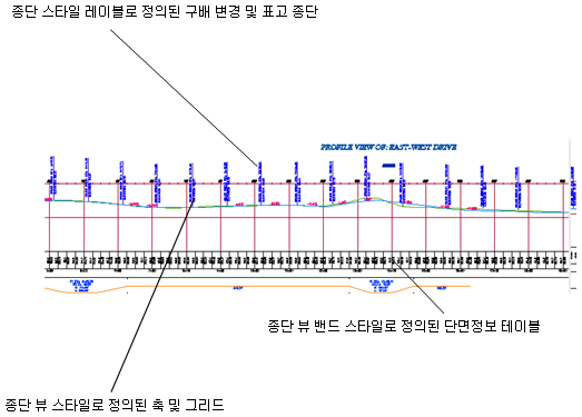 종단 뷰에는 하나 이상의 관련 종단과 X축을 따라 그리드 위 또는 아래에 있는 여러 데이터 밴드가 포함될 수 있습니다. 데이터 밴드는 종단에 측점 화면표시, 표고, 수평 지오메트리, 공학 분석에 도움이 되는 기타 데이터 등을 주석으로 추가합니다.
