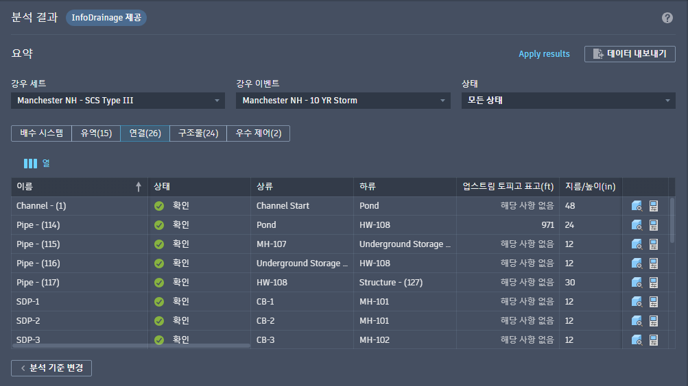 시스템 분석이 완료되면 결과가 시스템 수준에서 객체 범주(유입, 파이프, 구조물 및 우수)로 보고됩니다.