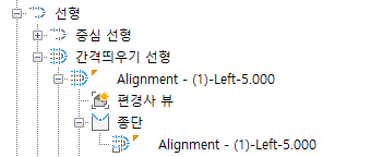 - 간격띄우기 종단을 자체 종단 뷰에 삽입합니다. 종단 뷰 작성 명령으로 종단 뷰를 작성할 때 일반 페이지에서 간격띄우기 선형을 선형으로 선택합니다.