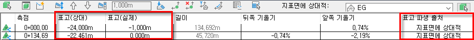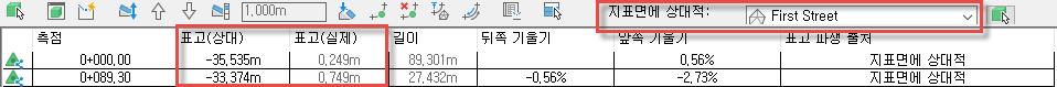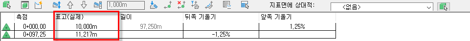 지표면이 첫 번째 도로로 변경되면 표고(상대적) 열에서 값이 첫 번째 도로 지표면 표고에 바로 적용되어 표고(실제) 열에서 새 표고가 발생합니다.