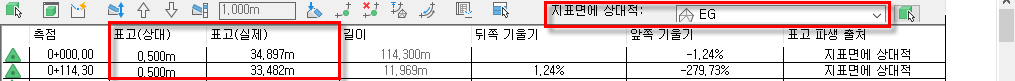 지표면 EG에 상대적으로 변경되면 실제 표고는 동일하게 유지되고 표고(상대적) 열은 형상선과 지표면 간의 표고 차이를 보여 줍니다.