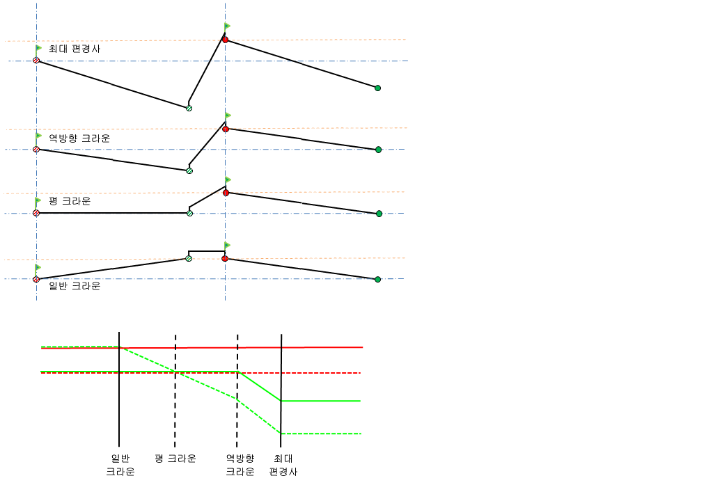 왜곡된 중앙분리대는 편경사가 적용되면 중앙분리대 폭이 동일하게 유지되지만 양쪽 측면은 편경사를 수용하기 위해 올라가거나 내려갑니다. 이 옵션은 중앙분리대 쉐이프를 왜곡하고 피벗 점은 원래 위치를 유지합니다.