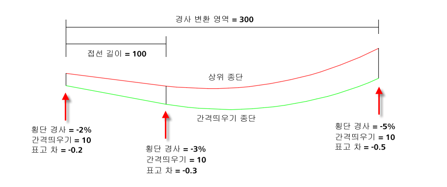 - 표시되는 표고 차는 상위 종단 및 간격띄우기 종단이며 횡단 경사 및 차선 폭에 의해 결정됩니다.