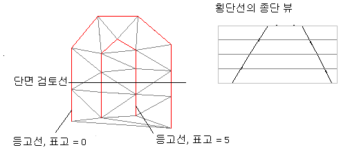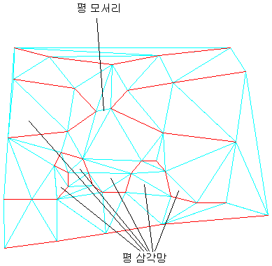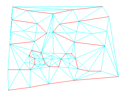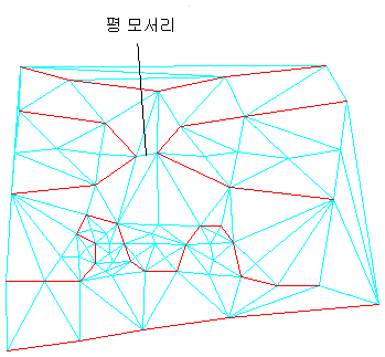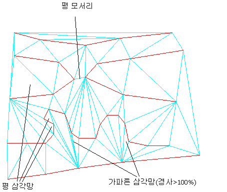 다음 그림은 지표면의 삼각망(하늘색)이 빨간색 등고선으로부터 작성된, 평평한 면적을 가진 지표면을 보여 줍니다. 평 삼각망과 평 모서리의 일부는 다음과 같이 표시됩니다.