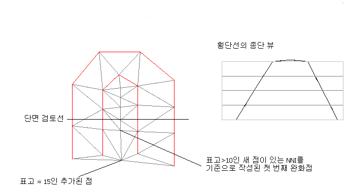 NNI 보간이 주변 점을 사용하여 새 점에 적절한 표고를 결정하기 때문에 이러한 결과가 발생합니다. 모든 주변 표고가 평 삼각망보다 낮기 때문에 평 삼각망보다 낮은 표고가 추가점으로 선택되어 능선이 급경사를 이루게 됩니다.