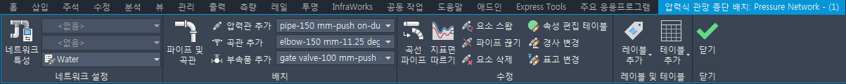 파이프 끊기: 압력관을 선택한 점에서 두 개의 압력관으로 나눕니다. 압력관이 연결되고 원래 압력관과 동일한 네트워크에 포함되어 있습니다.