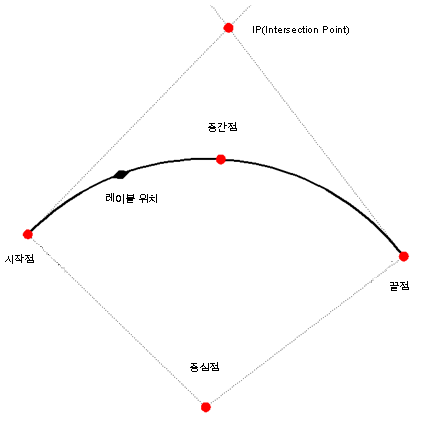 완화곡선 레이블의 경우 레이블 위치, 시작점, 끝점 및 중간점 부착점 외에도 IP(Intersection Point) 부착점이 있습니다.