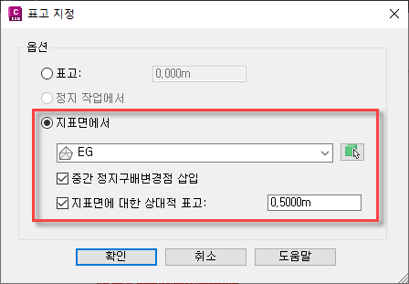 리스트에서 지표면을 선택하거나 화살표 아이콘을 클릭하여 도면에서 지표면을 선택합니다.