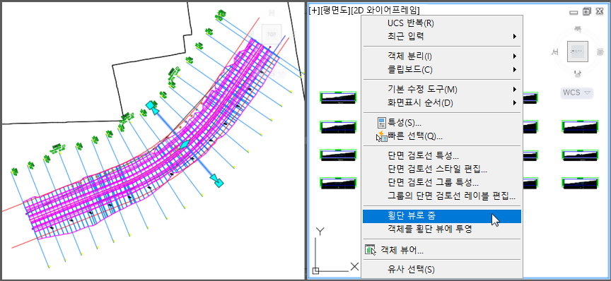 - 마우스 오른쪽 버튼을 클릭하고 단면 검토선으로 줌 또는 횡단 뷰로 줌을 선택합니다.