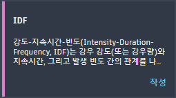 - IDF 작성을 클릭하여 강우 리스트에 IDF 강우 데이터 세트를 추가합니다.