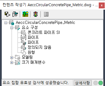 매개변수 만들기 환경이 열리면 요소 브라우저의 최상위 폴더가 요소 구성 폴더입니다. 요소 구성은 범위(파이프 또는 구조물), 유형, 하위 유형 등에 따라 요소의 특징과 동작을 정의하며 요소를 저장하는 데 필요합니다. 요소가 제대로 유효성 검사를 받고 저장되도록 하려면 요소 모델링을 시작하기 전에 요소 구성을 정의해야 합니다.