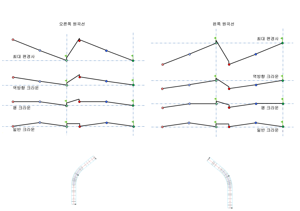다음 그림에서는 분할된 크라운형 도로의 오른쪽 피벗 방법을 설명합니다.