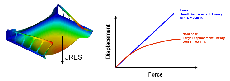 The geometric nonlinearity becomes a concern when the part(s) deform such that the small strain assumptions are no longer valid. The large displacements effects are a collection of different nonlinear properties, such as: