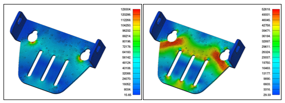 The metal bracket from the image below shows the very different stress distribution between linear and nonlinear materials. The metal has a yield stress of 50ksi. The left image contains the results of a linear material analysis and show peak stresses well above yield. The nonlinear material analysis on the right shows a much different contour due to the stress redistribution. Peak plastic strain was 1% in the nonlinear material analysis.