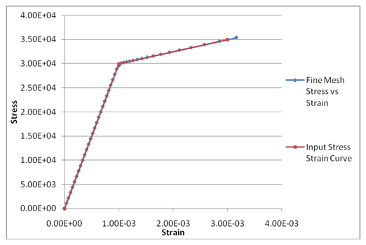 The two images below show the stress-strain curves for two different mesh density. You can see how a finer mesh follows the input stress-strain curve more accurately.