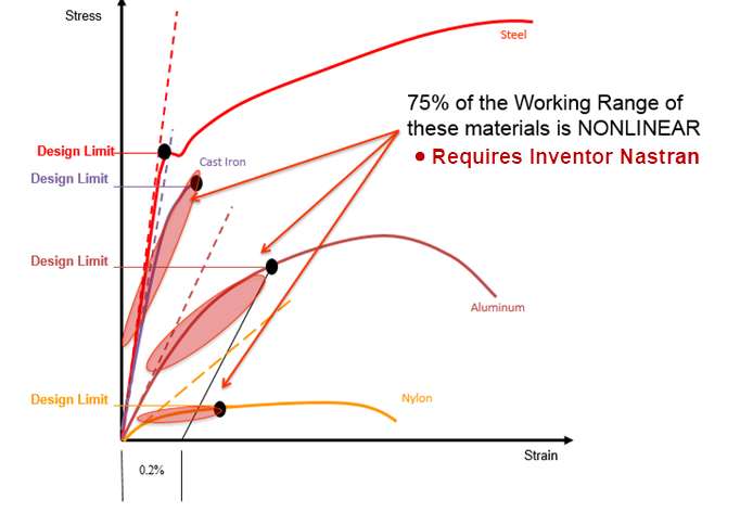 As you can see in the image below, nylon, aluminum and cast iron are materials with 75% of their working range in the nonlinear state. They require the use of an FEA program like Inventor Nastran to calculate the structural response to operating loads.