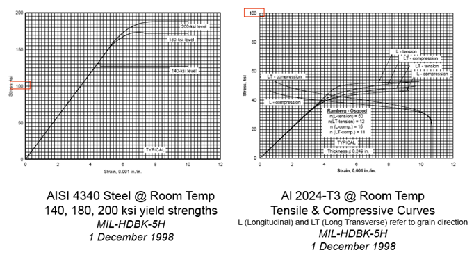 Stress-strain curves for metals are typically measured in tension or compression tests. The tensile test for metals is ASTM E8 and allows for multiple strain rates and material temperatures. The graphs below show stress-strain curves for 4340 Steel and 2024 Aluminum. You can see that the steel curves show a consistent slope, or Young’s Modulus until yield. The aluminum curve shows the variation in stress-strain response as different material orientations are examined. The curve also shows that 2024-T3 is asymmetric in that its tensile and compressive responses differ.