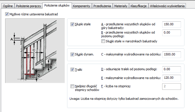 | dodać tralki do balustrady | wybierz opcję Tralki. Można wówczas podać wartość Maksymalnie wyśrodkowane na odcinku. |