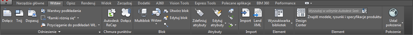 Karta wstaw zawiera opcje odnośników, multibloków, bloków, atrybutów oraz bibliotek zewnętrznych, takich jak np. Wyszukiwarka bibliotek.