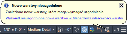 Przed wykonaniem pewnych zadań, takich jak drukowanie, zapisywanie lub przywracanie stanu warstwy użytkownik może być informowany, kiedy nowe warstwy dodawane są aktualnego rysunku lub jednego z dołączonych do niego odnośników zewnętrznych. W ten sposób można uniknąć potencjalnych problemów, takich jak drukowanie obiektów, które zostały dodane do rysunku poprzez dodanie nowej warstwy. Użytkownik może kontrolować kiedy, jeżeli w ogóle, rysunek jest oceniany pod kątem nowych warstw. Użytkownik może określić, które polecenia, jak np. ZAPISZ lub WYDRUK, wymuszają na oprogramowaniu sprawdzenie listy warstw i ostrzeżenie w przypadku wystąpienia nowej warstwy. Polecenie to może zostać ograniczone do nowych warstw, które zostały dodane do dołączonych odnośników zewnętrznych lub obejmować warstwy na aktualnym rysunku i dołączonych odnośnikach zewnętrznych.