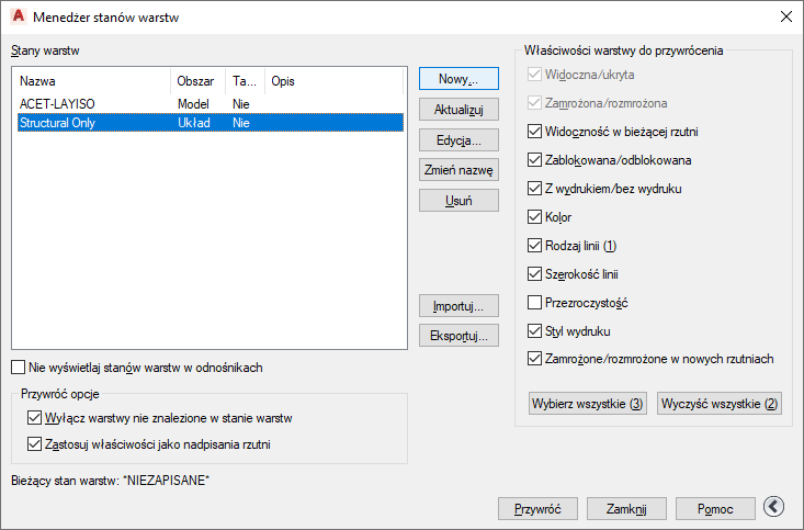Ustawienia warstw obejmują stany warstw, takie jak włączona lub zablokowana, oraz właściwości warstw, takie jak kolor lub rodzaj linii. Można wybrać, które stany i właściwości warstw mają zostać przywrócone w przyszłości. Na przykład można wybrać tylko przywrócenie ustawień zablokowanych/odblokowanych warstw na rysunku, ignorując wszystkie inne ustawienia. Jeżeli przywrócony zostanie stan warstwy o danej nazwie, wszystkie ustawienia pozostaną niezmienione, z wyjątkiem określonego stanu warstwy jako zablokowanej lub odblokowanej.