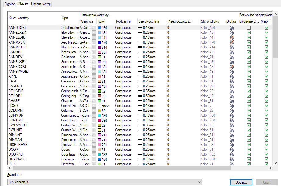 Standardy warstw ustanawiają konwencje nazewnictwa warstw na rysunku. Standard warstw zawiera zestaw reguł, które określają strukturę nazw warstw na rysunku. Podczas instalowania programu można wybrać standardy warstw z listy standardów. W razie potrzeby można później zmienić lub edytować każdy standard warstw.