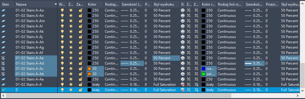 Obecnie użytkownik może nadpisywać kolor, rodzaj linii, szerokość linii oraz styl wydruku dla warstw w poszczególnych rzutniach układu. Jest to wydajny sposób wyświetlania obiektów o różnych ustawieniach właściwości w indywidualnych rzutniach, bez zmiany ich własności JakWarstwa i JakBlok. Ponieważ nadpisanie właściwości warstwy nie zmienia ogólnych właściwości warstwy, można wyświetlać obiekty w różny sposób w różnych rzutniach, bez konieczności tworzenia nowej geometrii lub używania odniesień o innych ustawieniach warstwy. Jeżeli Menedżer właściwości warstw zostanie otwarty z karty Układ, wyświetlane są 4 dodatkowe kolumny do nadpisywania własności warstwy charakterystycznych dla rzutni - Kolor rzutni, Szerokość linii rzutni, Rodzaj linii rzutni, Styl wydruku rzutni.