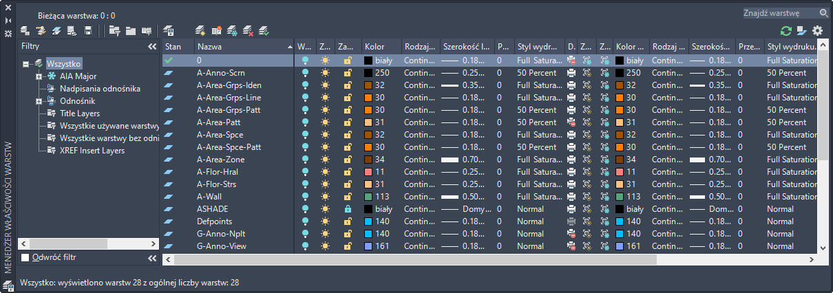 Menedżer właściwości warstw pomaga organizować, sortować i grupować warstwy oraz umożliwia pracę ze standardami warstw, stylami kluczy warstw, filtrami warstw, nadpisywaniem warstw i zapisywać stany warstw.