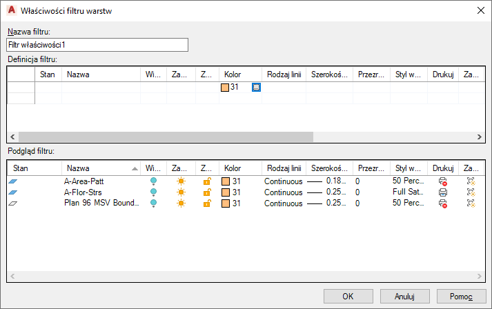 Aby usprawnić zarządzanie dużymi zestawami warstw, można utworzyć filtry warstw. Menedżer właściwości warstw umożliwia tworzenie trzech typów filtrów warstw: filtrów grup, filtrów właściwości i filtrów standardów warstw. Filtry właściwości grupują warstwy w oparciu o właściwości i stany warstw, takie jak np. widoczność lub kolor. Filtry grup zawierają wszystkie warstwy, które zostały do nich wprowadzone. Filtry standardów zawierają warstwy skojarzone z określonymi kategoriami standardów warstw.