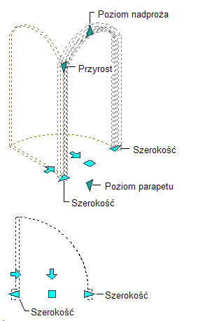 Na obiektach w programie zestaw narzędzi AutoCAD Architecture 2027 znajdują się uchwyty umożliwiające operowanie. Zatrzymaj kursor na uchwycie, aby wyświetlić etykietę określającą funkcję tego uchwytu.