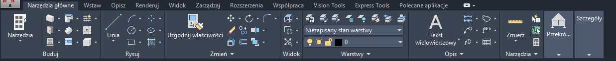 Karta Narzędzia główne zawiera najczęściej używane w programie polecenia. Można tam znaleźć podstawowe narzędzia obiektów i rysunkowe, jak również inne często używane narzędzia , takie jak narzędzia zmian, warstw i podstawowych opisów. Karta Narzędzia główne służy jako punkt początkowy w nowym rysunku.