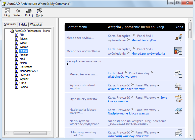 Narzędzie Wyszukiwanie poleceń to plik pomocy zawierający wykaz poleceń uporządkowanych według ich poprzedniego położenia w menu, w którym podano ich obecną lokalizację na wstążce.