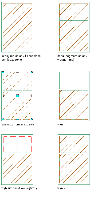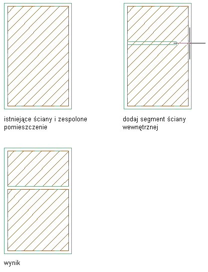 Pomieszczenia zespolone można dzielić, dodając nowe obiekty ograniczające. Jeśli włączono automatyczną aktualizację pomieszczeń zespolonych, aktualizacja zostanie przeprowadzona automatycznie.