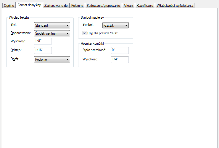 - Wybierz lub odznacz opcję użycia dla prawdy i fałszu, aby kontrolować, czy symbole tabeli lub tekst w formacie danych właściwości będą używane dla wartości prawda/fałsz.