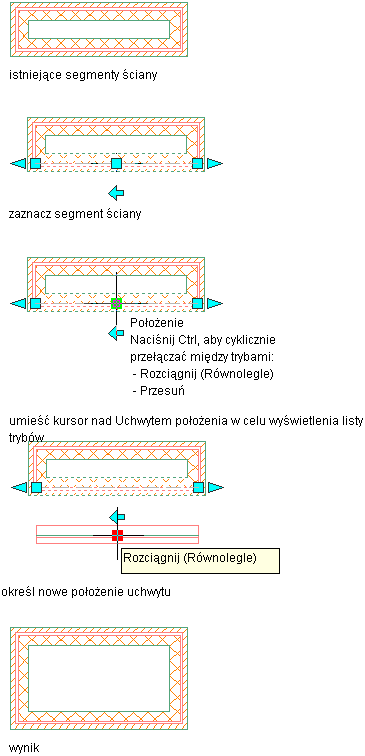 Na poniższej ilustracji jest przedstawiony sposób używania uchwytu Położenie w trybie Rozciągnij (Równoległy). Ten tryb umożliwia przenoszenie połączonego równoległego segmentu ściany wraz z zachowaniem połączeń przyległej ściany.
