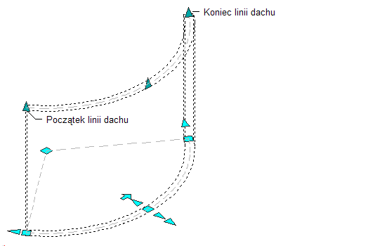 Na poniższej ilustracji są przedstawione uchwyty Linia początkowa dachu i Linia końcowa dachu wyświetlane w przypadku segmentów krzywych ścian w widokach 3D i 2D.