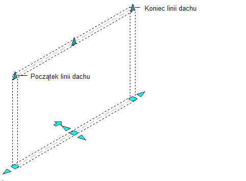 Na poniższej ilustracji są przedstawione uchwyty Linia początkowa dachu i Linia końcowa dachu wyświetlane w przypadku segmentów prostych ścian w widokach 3D i 2D.
