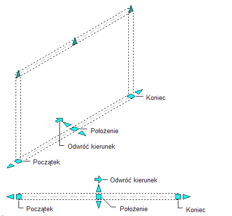 Na poniższej ilustracji są przedstawione uchwyty Początek, Koniec, Odwróć kierunek i Położenie wyświetlane w przypadku segmentów prostych ścian w widokach 3D i 2D.