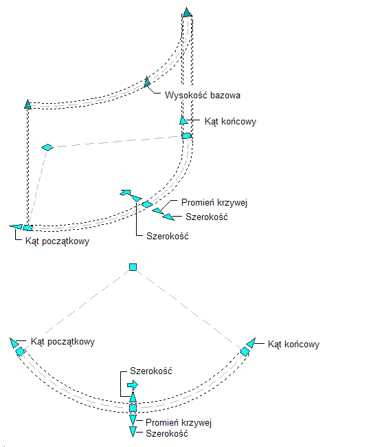 Na poniższej ilustracji są przedstawione uchwyty Kąt początkowy, Kąt końcowy, Szerokość i Promień krzywej wyświetlane w przypadku segmentów krzywych ścian w widokach 3D i 2D.