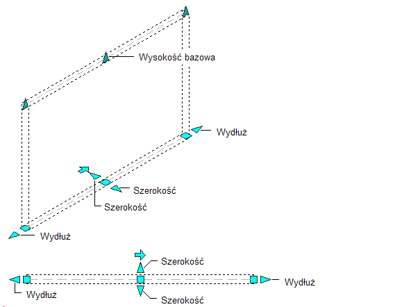 Na poniższej ilustracji są przedstawione uchwyty Przedłuż, Szerokość i Wysokość bazowa wyświetlane w przypadku segmentów prostych ścian w widokach 3D i 2D.