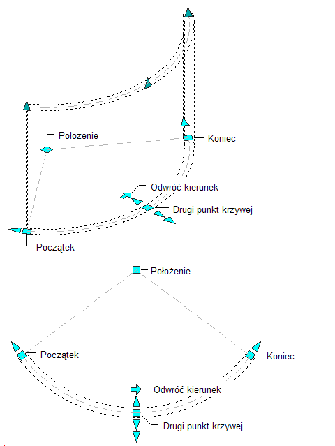 Na poniższej ilustracji są przedstawione uchwyty Początek, Koniec, Odwróć kierunek, Drugi punkt krzywej i Położenie wyświetlane w przypadku segmentów krzywych ścian w widokach 3D i 2D.