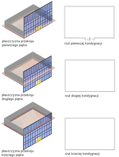 Na poniższych ilustracjach przedstawiono ścianę kurtynową, która rozciąga się na wysokości 3 poziomów. Na ilustracjach po lewej stronie wskazano płaszczyznę tnącą skojarzonego rysunku poziomu. Rzuty po prawej stronie przedstawiają sposób wyświetlania ściany kurtynowej w widoku Rzut na każdym poziomie. Należy zwrócić uwagę na różnice w wyglądzie drzwi i szprosów na rzutach poszczególnych kondygnacji.