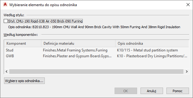 | ze stylem obiektu lub z definicją materiału wybranych komponentów obiektów został już skojarzony jeden lub więcej opisów odnośników | Zostanie wyświetlone okno dialogowe wyboru elementu do opisania odnośnikiem.