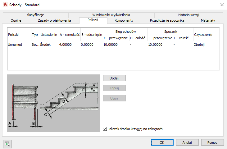 Gdy opcja Policzki środka krzywej na zakrętach jest wyczyszczona, środkowy policzek jest dopasowywany do kąta kolejnego bieg schodów za spocznikiem. W większości przypadków będzie do kąt prosty, ale jest możliwy dowolny inny kąt.