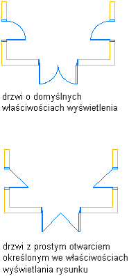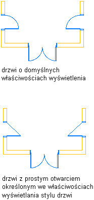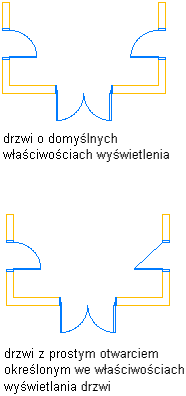 Jeśli materiał nie jest używany do sterowania wyświetlaniem, można dostosować wygląd obiektu poprzez zmianę jego właściwości wyświetlania dla reprezentacji wyświetlania. Na przykład można wyłączyć otwarcie drzwi w reprezentacji wyświetlania typu plan; określić, czy otwarcie jest proste czy łukiem; określić procent otwarcia; lub zmienić warstwę, kolor i rodzaj linii otwarcia.